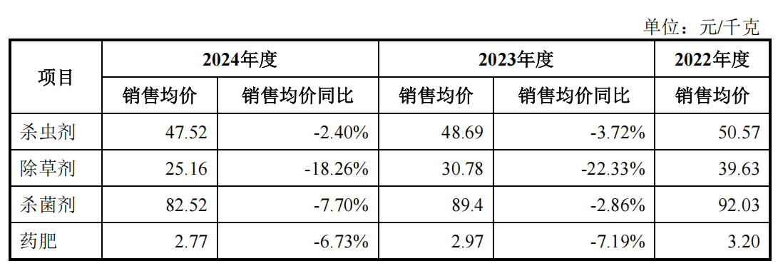 从行业发展趋势看,近年来,同行业农药制剂企业数量众多、同质化竞争严重,田园生化主营产品的销售单价均出现下滑,其中,除草剂价格下滑尤为明显,2022-2024年,其销售单价分别为39.63元/千克、30.78元/千克、25.16元/千克,2023年同比下滑22.33%,2024年同比下滑18.26%。