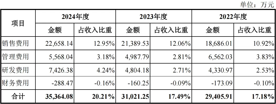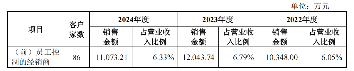 此外,据披露,2022-2024年,公司对(前)员工控制的经销商销售金额分别为10,348.00万元、12,043.74万元和11,073.21万元,占营业收入比例分别为6.05%、6.79%和6.33%。