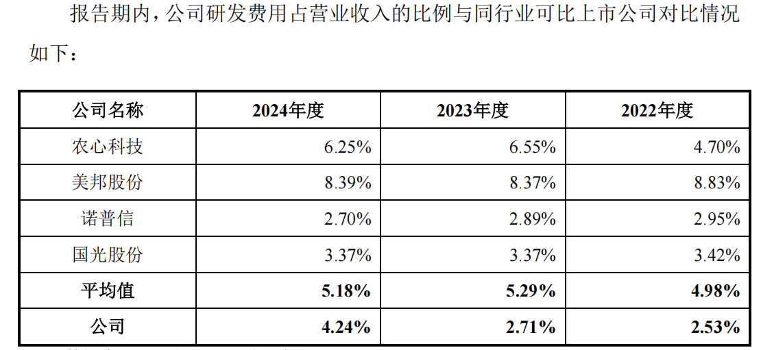 可以说,研发投入是农药企业生存的生命线。但是,田园生化在研发投入方面却长期处于行业“洼地”。2022-2024年,公司研发费用率分别为2.53%、2.71%、4.24%,持续低于行业平均水平。