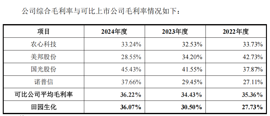 2022-2024年,田园生化销售费用占营业收入的比例高于同行业可比上市公司,但是公司综合毛利却低于同行业可比公司平均毛利率。