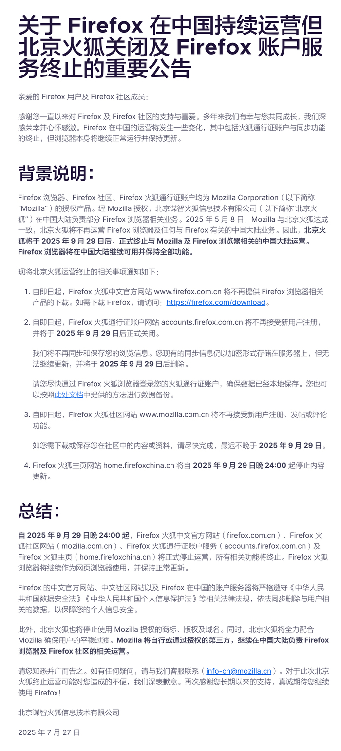 Firefox浏览器、Firefox社区、Firefox火狐通行证账户均为Mozilla的授权产品。经Mozilla授权,北京火狐在中国大陆负责部分Firefox浏览器相关业务。2025年5月8日,Mozilla与北京火狐达成一致,北京火狐将不再运营Firefox浏览器及任何与Firefox有关的中国大陆业务。因此,北京火狐将于2025年9月29日后,正式终止与Mozilla及Firefox浏览器相关的中国大陆运营。Firefox浏览器将在中国大陆继续可用并保持全部功能。