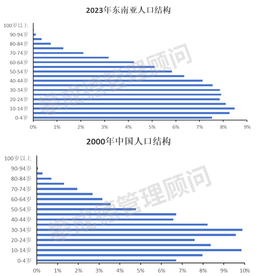 随着经济发展,东南亚的城镇化进程加快。数据显示,2023年东南亚五国(印尼、菲律宾、马来西亚、泰国、越南)平均城镇化率为55.7%,大致相当于2014年的中国;同期,东南亚人口结构呈现“正金字塔型”,大致相当于2000年的中国。