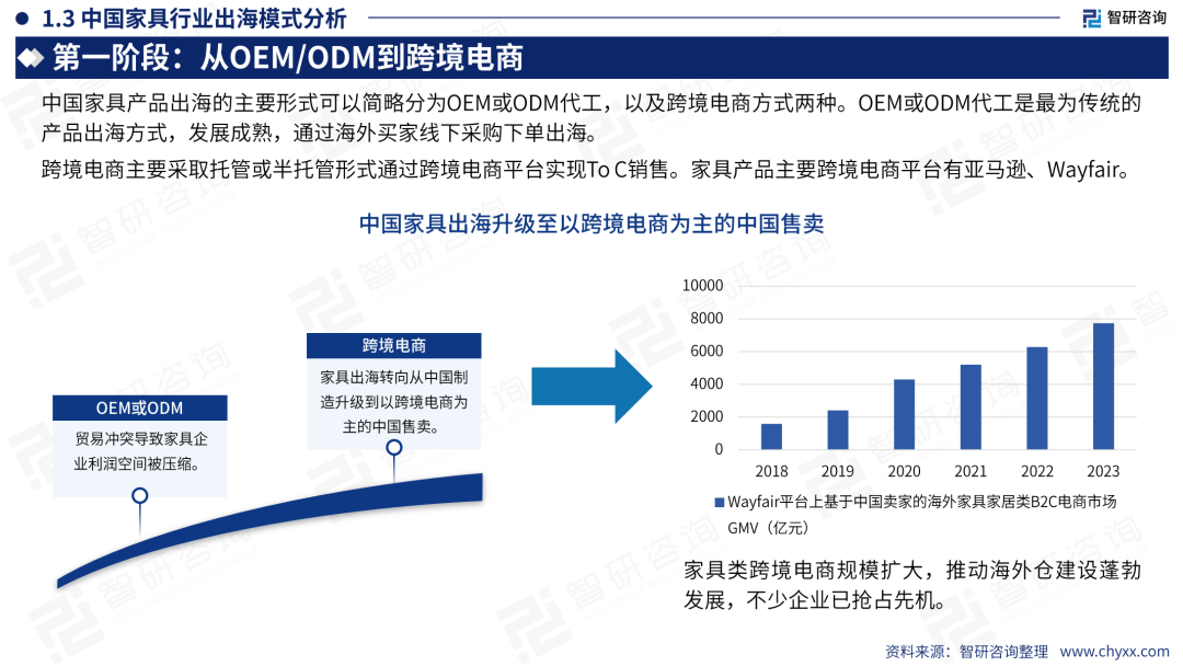 根据《2024中国家具行业出海市场发展形势及前景机遇研判报告》,中国家具企业出海已经历过3个阶段:第一阶段是以产品出口为主,传统模式是OEM或ODM代工,通过海外买家采购下单出口;跨境电商兴起后,通过电商平台实现TO C销售。