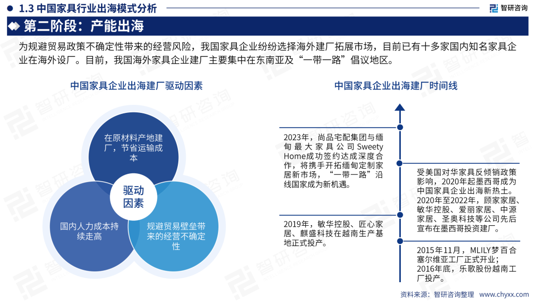 第二阶段,规避贸易政策不确定性带来的风险,家具企业选择海外建厂拓展市场。中国家具企业海外基地主要集中在东南亚及“一带一路”倡议地区。