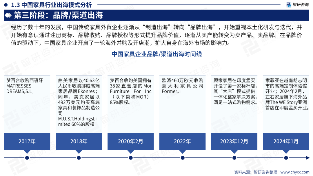 第三阶段,推动品牌与渠道出海。家具企业对外输出品牌、团队、技术、设计、服务、渠道等方面,实现海外本土化建设。