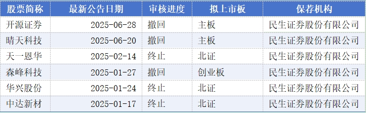 民生证券项目企业包括开源证券、晴天科技、天一恩华、森峰科技、华兴股份、中达新材。