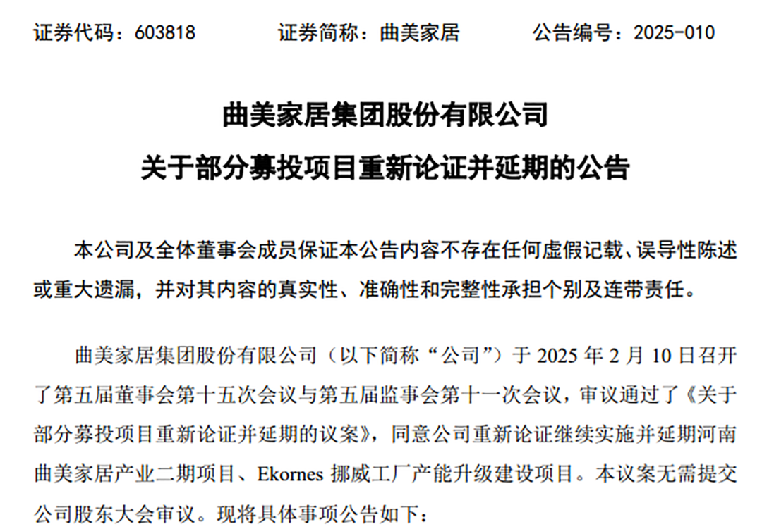 2025年2月10日,曲美家居发布公告,Ekornes挪威工厂业务整体恢复进度尚未达到预期水平,现阶段产能已足够覆盖销售需求,Ekornes挪威工厂产能升级建设项目建成时间将会延期,达到预定可使用状态日期从2025年9月延至2026年12月31日。