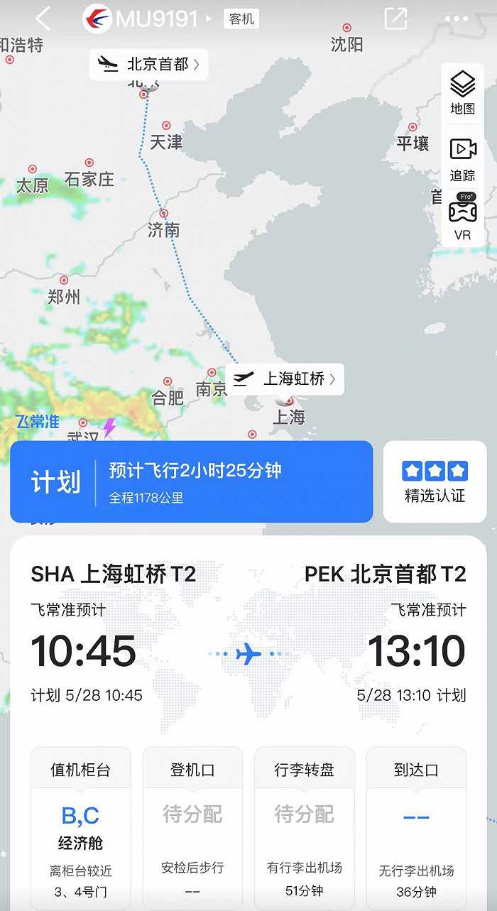 据飞常准APP,东航首架C919客机(B-919A)的首个商业航班飞行计划公布,将于5月28日起飞,班次为MU9191上海虹桥-北京首都,MU9192北京首都-上海虹桥,计划飞行时长2小时25分钟。