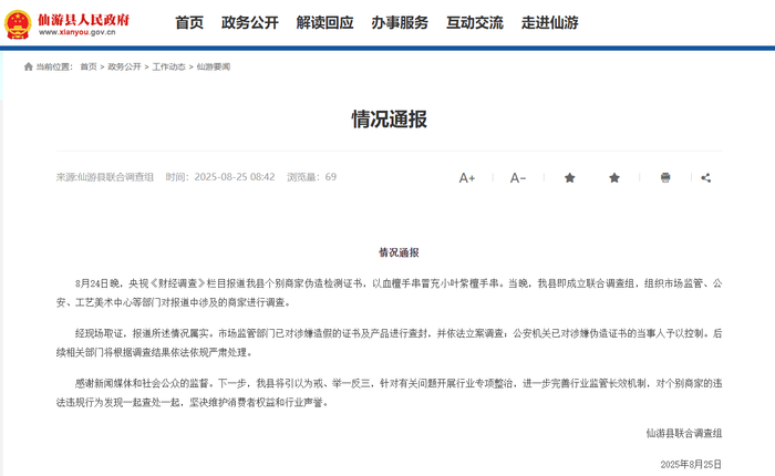 8月25日,福建仙游县联合调查组通报:8月24日晚,央视《财经调查》栏目报道我县个别商家伪造检测证书,以血檀手串冒充小叶紫檀手串。当晚,我县即成立联合调查组,组织市场监管、公安、工艺美术中心等部门对报道中涉及的商家进行调查。经现场取证,报道所述情况属实。市场监管部门已对涉嫌造假的证书及产品进行查封,并依法立案调查;公安机关已对涉嫌伪造证书的当事人予以控制。后续相关部门将根据调查结果依法依规严肃处理。