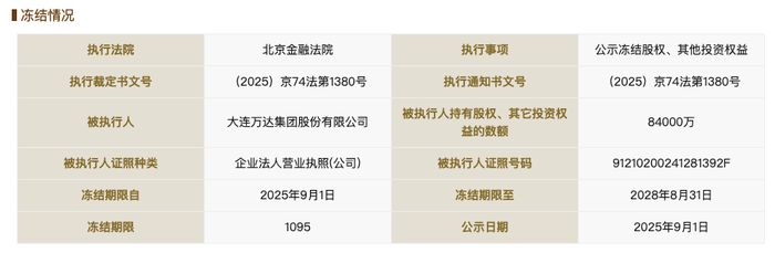 国家企业信用信息公示系统网站显示,9月1日,大连万达集团股份有限公司新增两则股权冻结信息,股权所在企业分别为上海万达网络金融服务有限公司、上海万达小额贷款有限公司,冻结股权数额合计94亿余元,冻结期限均为三年,执行法院均为北京金融法院。