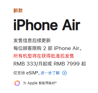 9月12日,苹果公司官网信息显示,iPhone Air发售信息将于后续更新,所有机型将在获得批准后发售。公司对此回应称,迫不及待希望用户能够体验iPhone Air。正与监管机构紧密合作,力争尽快在中国推出。