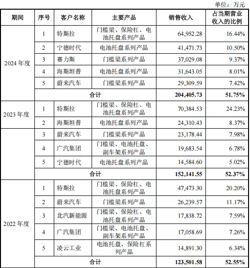 除了特斯拉,友升股份的大客户还包括宁德时代、赛力斯、蔚来汽车、广汽集团等,2022年至2024年,前五大客户的销售收入占当期营收比分别为52.55%、52.37%、51.75%,整体水平较高。