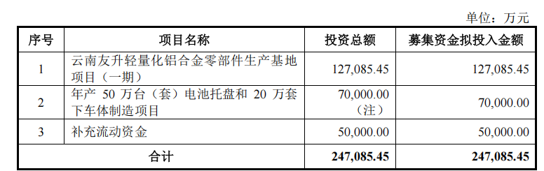 此次的募资金额大幅提升至24.7 亿元,12.7亿元用于云南友升轻量化铝合金零部件生产基地项目(一期),7亿元用于年产50台(套)电池托盘和20万套下车体制造项目,5亿元补充流动资金。