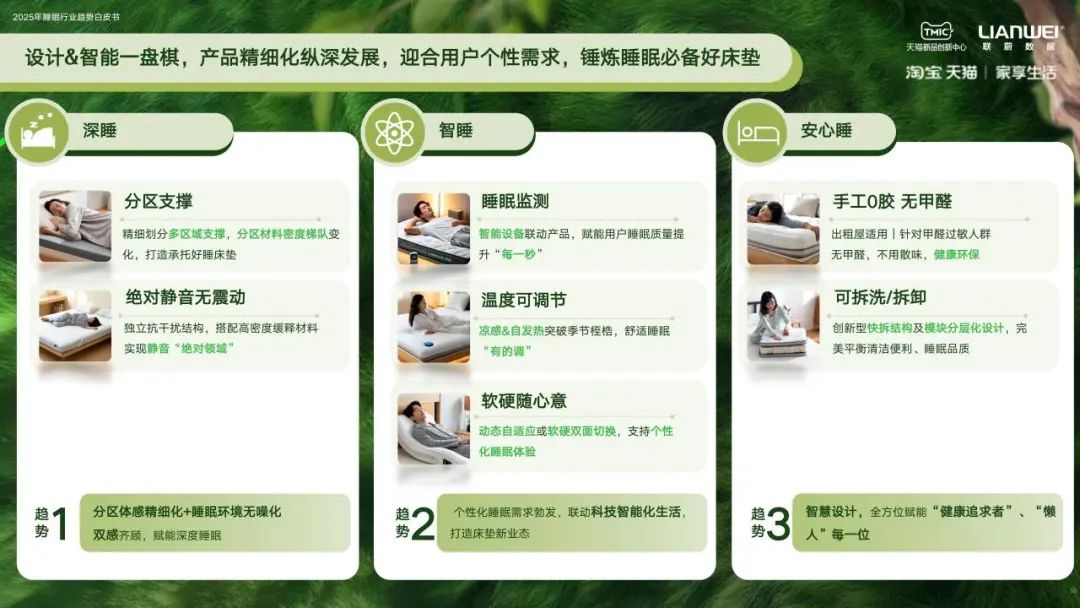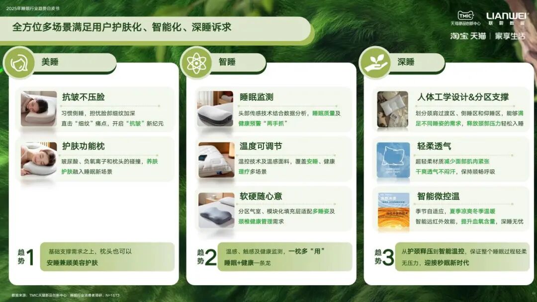 概括而言,睡眠行业整体进入“功能细分 + 智能加持 + 护肤助眠”时代。消费者趋向悦己、疗愈、智能便捷,关注“深度睡眠”“健康防护”等真实效能。