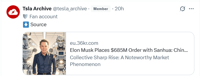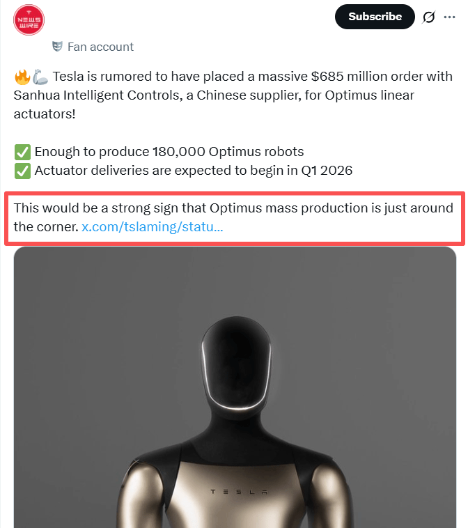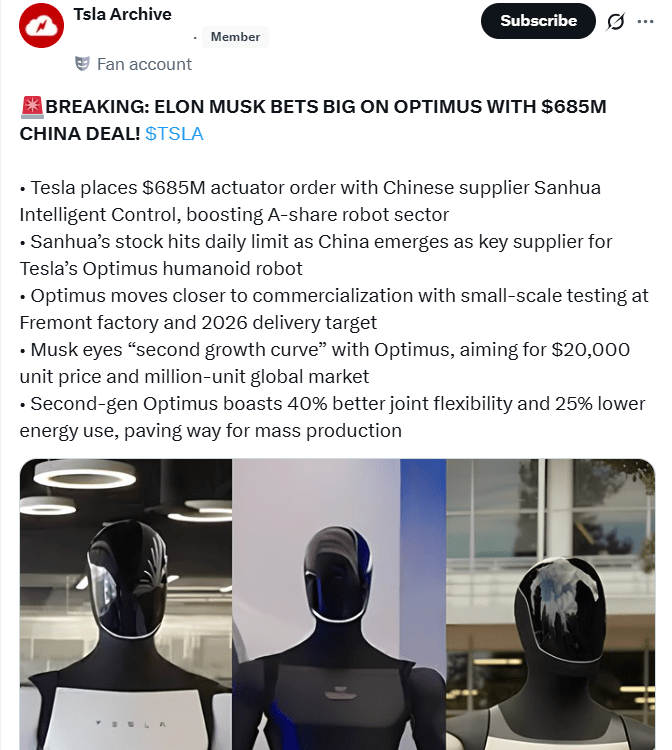 帖子中还写道:“行业估算显示,该订单量足以生产至少18万台Optimus机器人,强烈表明特斯拉对人形机器人量产及商业部署的紧迫承诺与高度信心。”