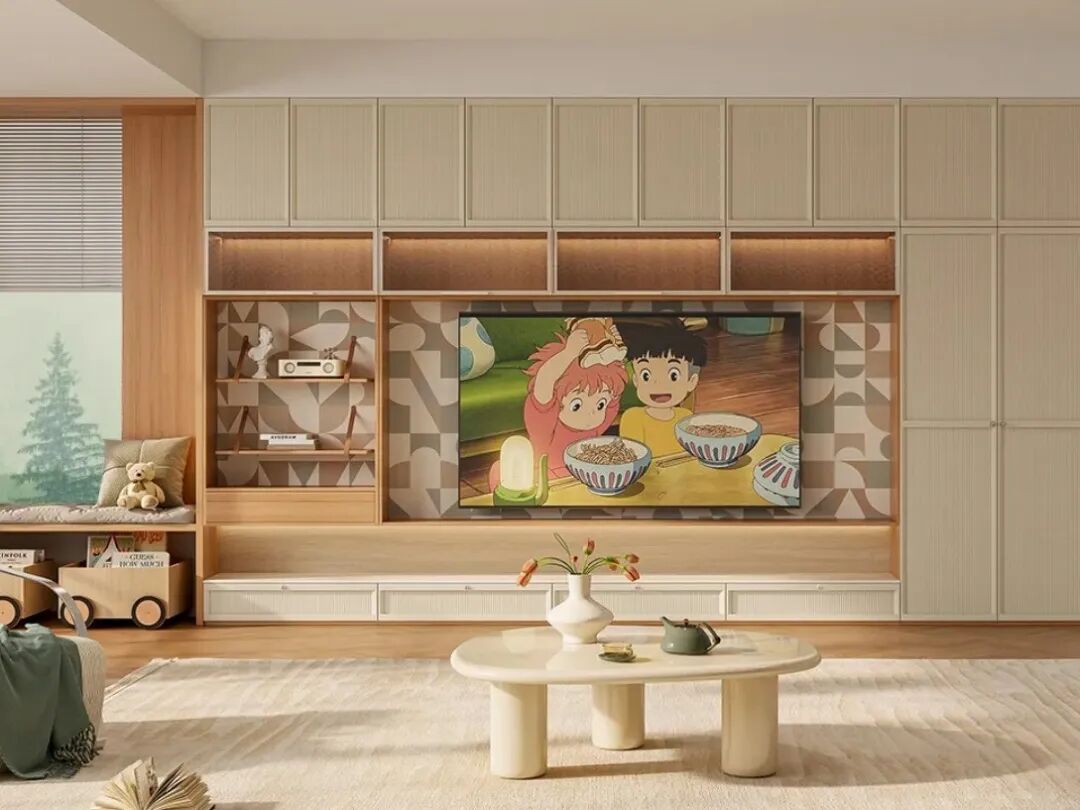 设计特点:柜体应用圆弧、异形门型、斜拼接抽屉,细节满满,充满童趣;收纳架移门柜,打破传统电视柜的功能局限;没有分割“儿童区”与“成人区”,只有被设计精心呵护的共生时光。
