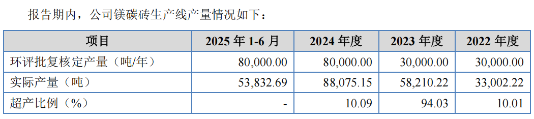 在招股书中,国亮新材还特别提示了镁碳砖车间超产风险。2025 年 1-9 月,公司镁碳砖车间的实际产量为 8.5万吨,环评批复核定产能为 8万吨/年,超产比例为 6.31%。若公司后续生产计划及防超产措施失效,公司 2025 年度镁碳砖车间的实际产量存在超过环评批复核定产能30%的风险以及因此受到相关主管部门行政处罚的风险。