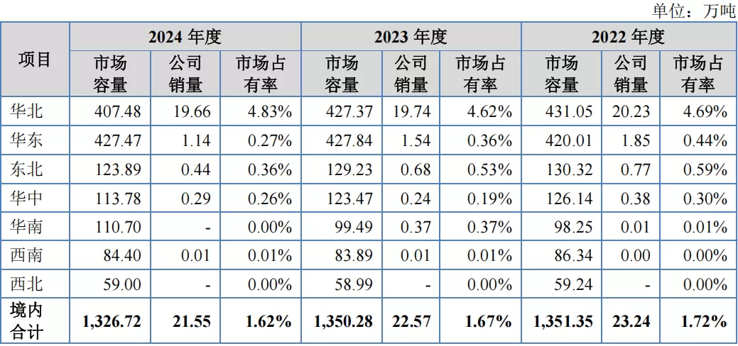 国亮新材位于河北唐山,目前公司境内业务主要集中在华北地区,其他地区销售规模较小。2022 年、2023 年和 2024 年公司在华北地区市场占有率分别为 4.69%、4.62%和 4.83%,公司在其他地区的市场占有率均低于 1%。