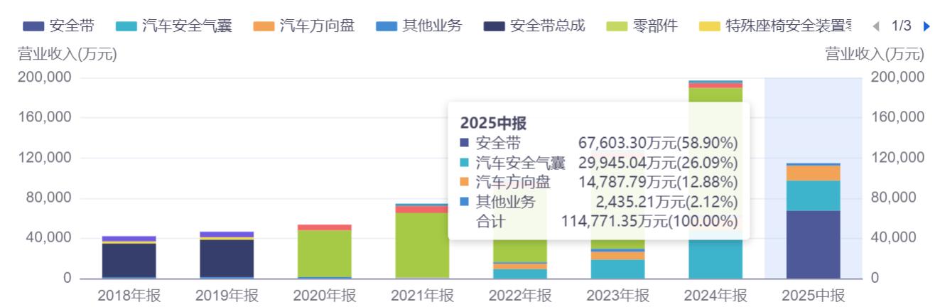 从2025年上半年收入结构来看,汽车安全带、安全气囊和方向盘为公司三大核心品类。其中,安全带仍是其支柱业务,收入占比近六成;安全气囊位居第二,贡献近26%的营收;方向盘业务占比近13%。