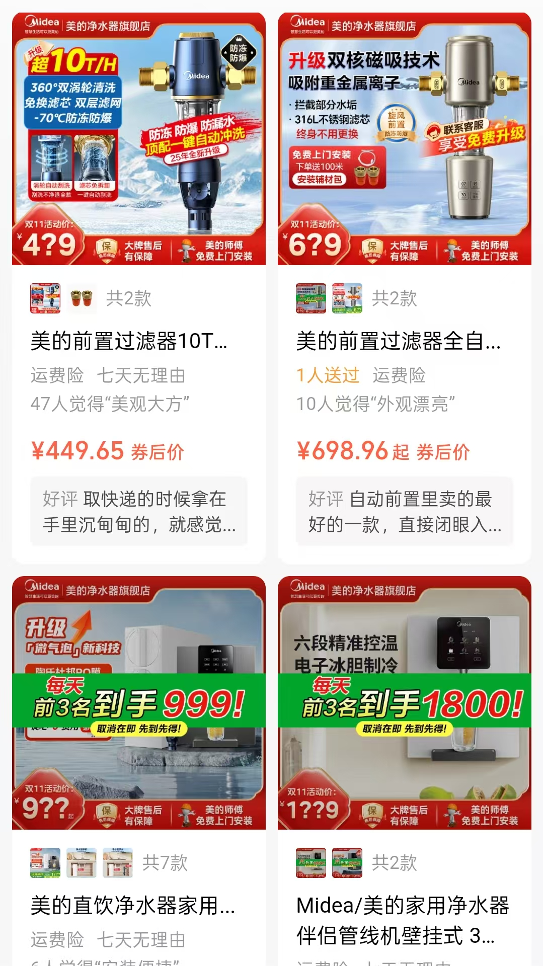 从渠道压力来看,安吉尔虽然手握1.7万家门店,但全屋净水系列依赖合作装企、设计师等中间渠道,叠加明星代言导致的高额营销费,很难赢得更高利润空间;而美的利用全品类家电的庞大流量,凭借“套购满减”等方式为净水器引流,获客成本会低很多。