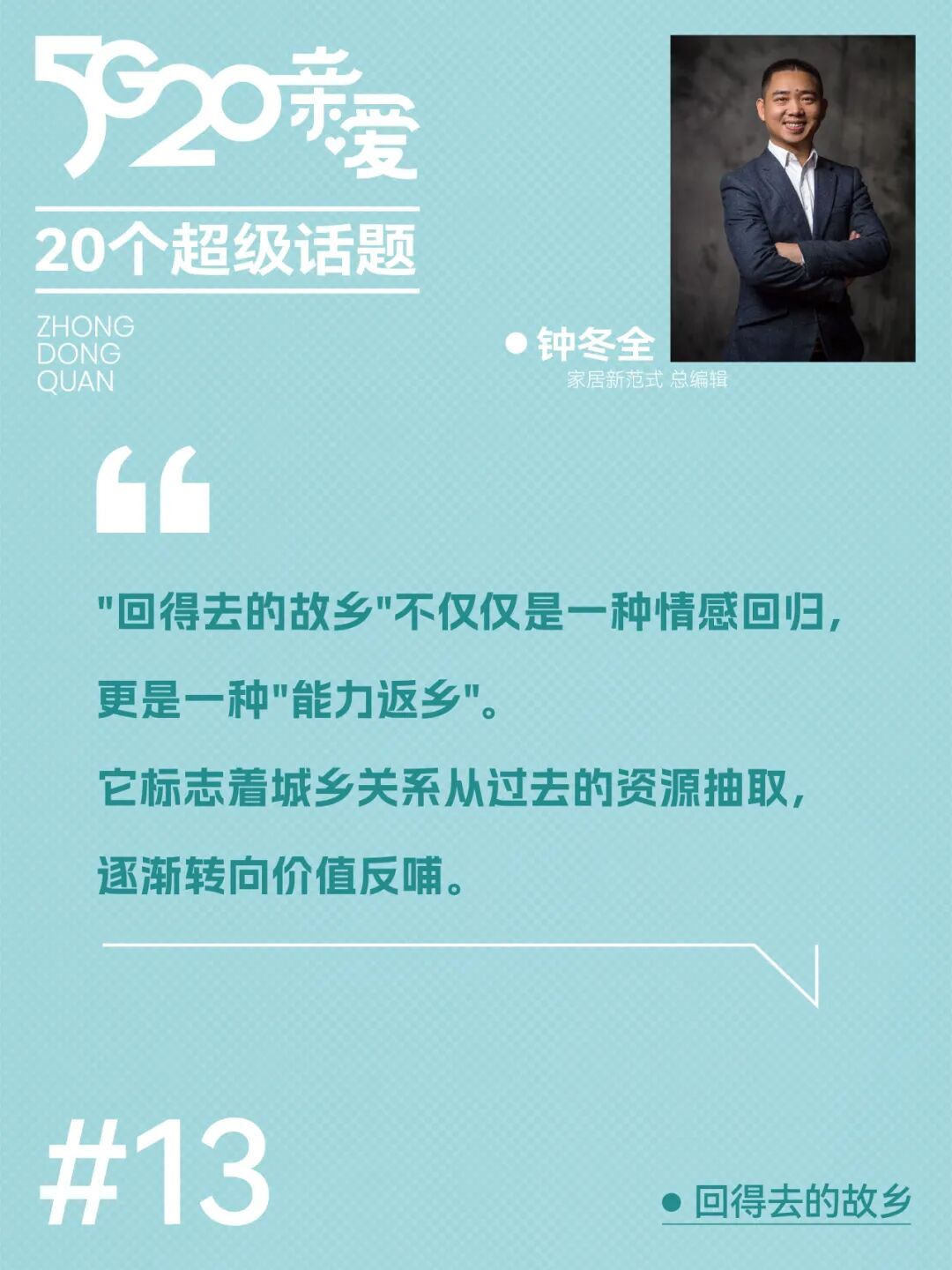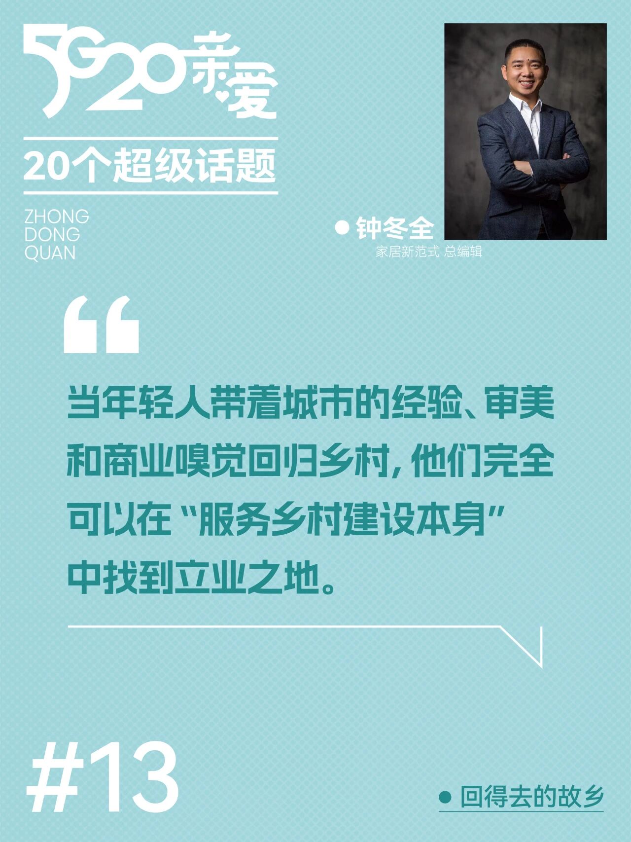 这对我们(特别是家居建材行业)的启示是:中国市场的深度超乎想象。当年轻人带着城市的经验、审美和商业嗅觉回归乡村,他们完全可以在“服务乡村建设本身”中找到立业之地——无论是成为优质建材的本地服务商,一家有设计能力的装修公司,还是一个整合资源的项目管理者。这不仅仅是回乡,更是用新的商业形态参与并引领故乡的进化。