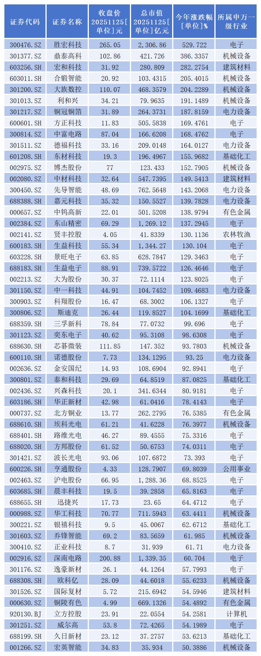 胜宏科技、鼎泰高科、宏和科技、合锻智能、大族数控、利和兴、铜冠铜箔、方正科技、中富电路、德福科技、东材科技、博杰股份、中材科技、先导智能、嘉元科技、中钨高新、东山精密、贤丰控股、生益科技、景旺电子、生益电子、大为股份、中一科技、科翔股份、斯迪克25家上市公司股价成功实现翻倍。