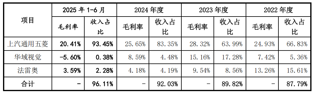 《招股书》显示,2022年-2024年,通宝光电向前五大客户销售占比均超过95%,向第一大客户上汽通用五菱销售占比分别为67%、64%以及83%。如果只看2025年上半年的数据,通宝光电对上汽通用五菱销售占比则更高,今年上半年对单一大客户上汽通用五菱销售占比达到了93%。