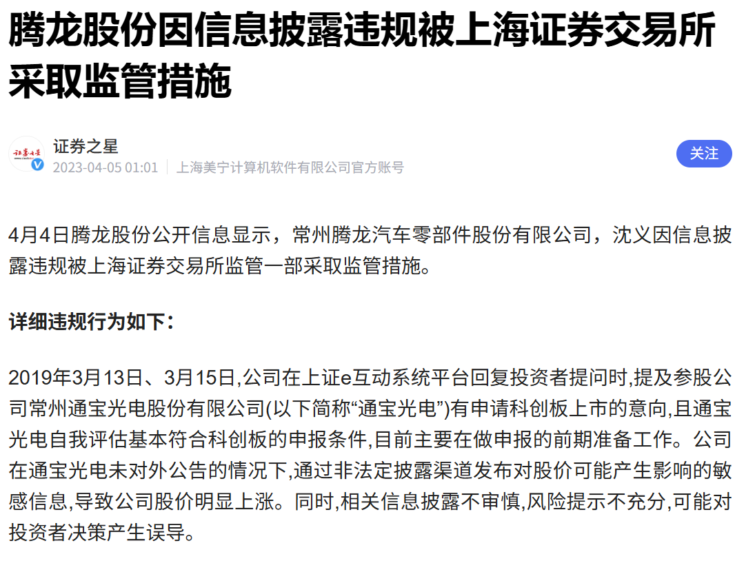 《奕泽财经》注意到,从2017年以来,通宝光电IPO多次“改道”,先是申报创业板,后更改为北交所,期间也公开透露冲刺科创板。2019年3月,上市公司腾龙股份,也就是通宝光电的股东,其董秘公开表示通宝光电有意申报科创板。该董秘沈义也因为违规披露该信息被上交所处罚。