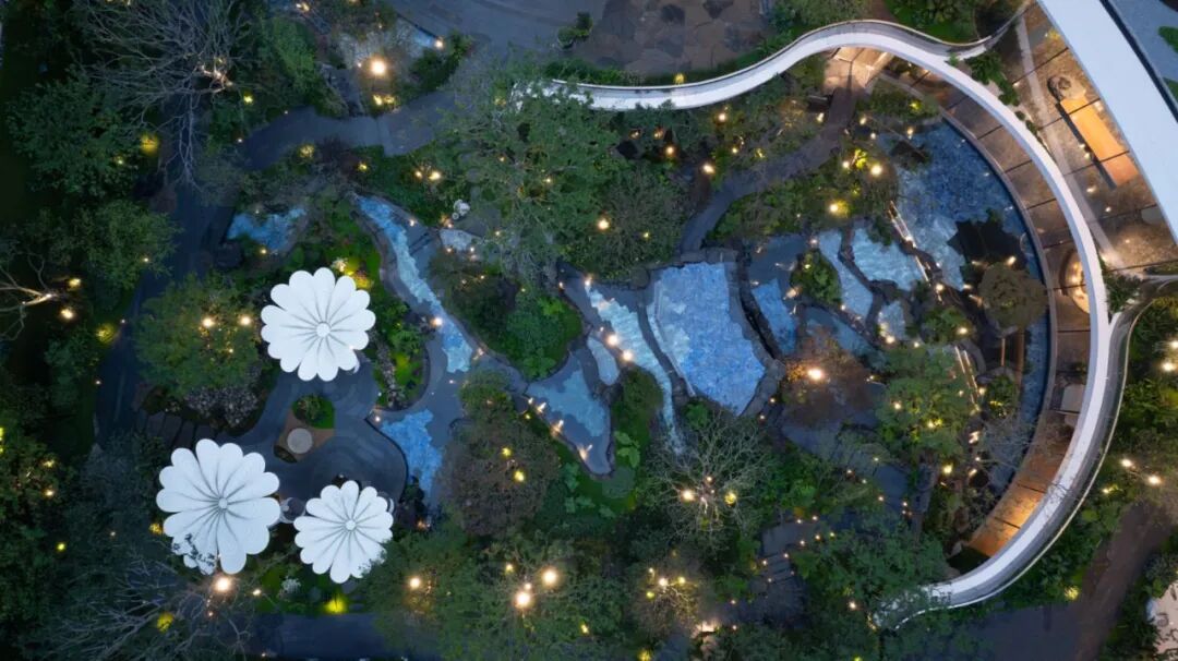 景观也做了打样试验,为呈现下沉庭院“斑斓瑞潭”九寨沟钙华池般的幻彩色泽,团队对亚马逊绿、普拉达蓝等多种稀有岩板进行分区组合铺设实验,在模拟水流下反复观察色彩融合与层次渐变。