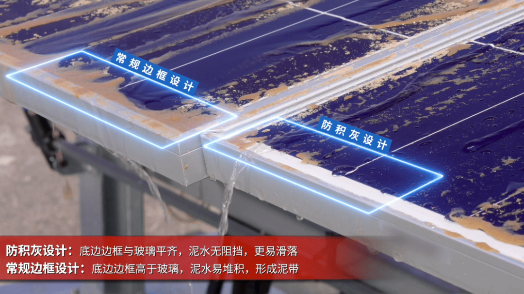 针对家居厂粉尘多、清理难的问题,Hi-MO X10优化了组件边框结构,采用短边无A面设计,使组件底边与玻璃表面近乎平齐,彻底消除粉尘淤积的“台阶”,大幅提升雨水自清洁效率。根据CPVT户外实证,该设计平均可带来超过2%的发电增益,积灰严重季节增益甚至超5%,既减少了发电量损失,又降低了人工清洗的频率与安全成本,适配家居厂的运维需求。