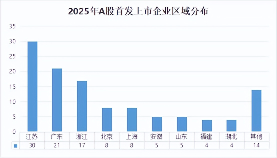 区域分布方面,2025年境内IPO企业延续“东强西弱”格局,长三角、珠三角地区持续领跑全国。江苏省以30家的新增上市企业数量拔得头筹,成为年度IPO第一大省,区域经济的活力与企业的创新实力尽显;广东省、浙江省分别以21家、17家位列二、三位,三省合计贡献超六成的新增上市企业,撑起境内IPO市场的“半壁江山”。北京、上海两地表现持平,均有8家企业上市,作为一线城市的资本集聚效应显著;安徽、山东两省各新增5家,福建、湖北各新增4家。其余省份上市企业数量相对较少,黑龙江、江西、内蒙古、四川各有2家,河北、吉林、辽宁、陕西、天津等地则各有1家企业实现IPO突破,区域资本市场发展不均衡的特征依然显著。