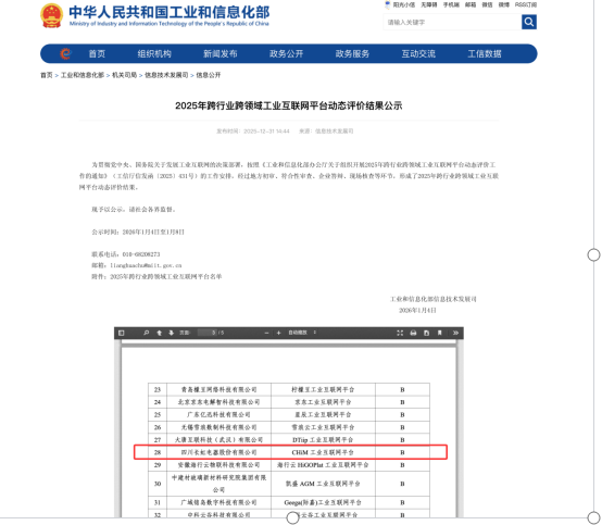 2026年1月4日,工业和信息化部2025年跨行业跨领域工业互联网平台动态评价结果正式公示,长虹工业互联网双跨平台(以下简称“长虹双跨平台”)排名再次提升6位,上升幅度居全国第三、西部第一,自2023年入选国家级“双跨”平台以来累计跃升17位,创下四川省工业互联网在该领域的历史最高排位。