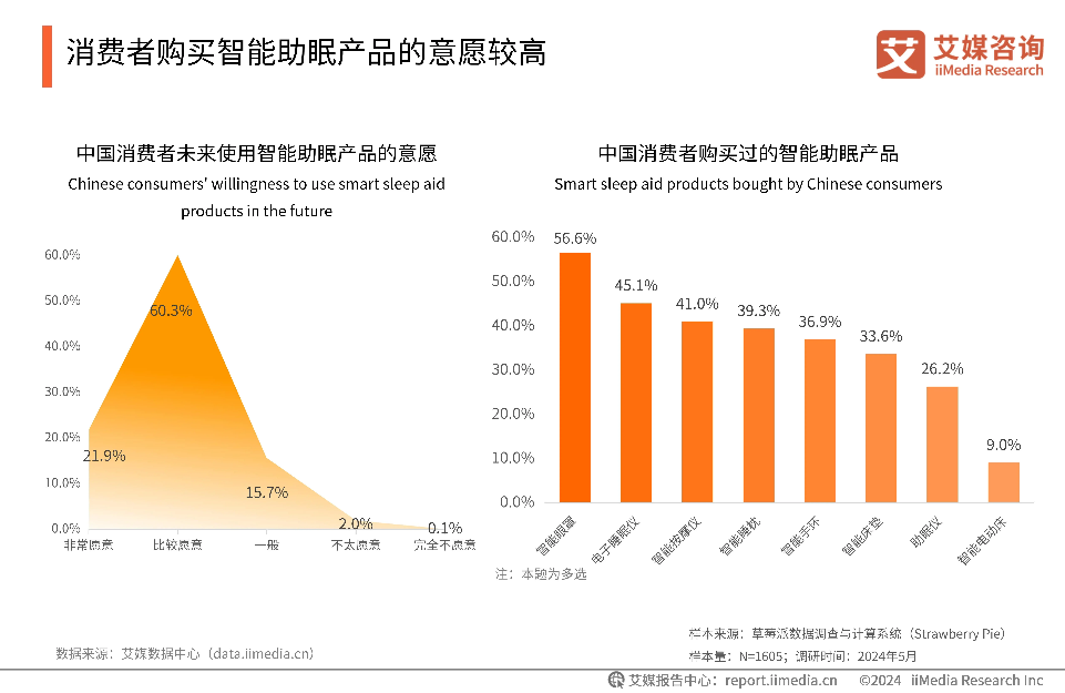 从消费者实际反馈来看,超八成消费者愿意在未来使用智能助眠设备,其中,超过三成消费者曾购买过智能睡枕、智能床垫等产品。