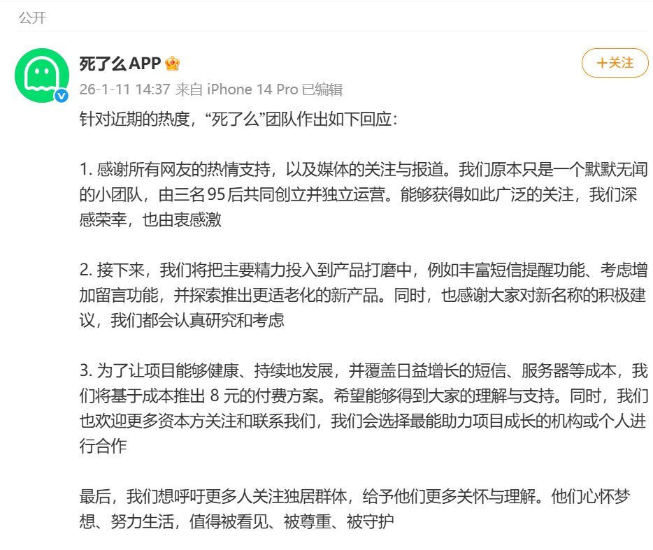 1月11日,@死了么APP 发文称,针对近期的热度,“死了么”团队作出如下回应: