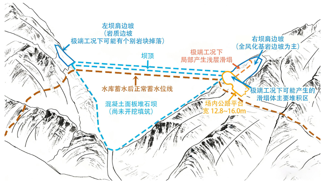 本工程下水库大坝采用混凝土面板堆石坝,尚未开始大坝主体施工。下水库坝肩边坡存在的部分锚筋桩、锚杆钢筋长度不足、焊接不规范、注浆量不足等问题将影响支护效果,可能导致边坡失稳。其中,左岸坝肩为岩质边坡,完整性较好,极端工况下可能有个别岩块掉落;右岸坝肩以全风化基岩边坡为主,稳定性相对较差,极端工况下可能发生约1000立方米的塌方,大部分塌方体将堆积在坝肩公路上(边坡与大坝间为场内公路,宽12.8米至16米,对应边坡垮塌位置可承接约2000立方米堆积体),导致场内交通道路受阻等,少量岩土体掉落坝顶或进入下水库,不会发生危害性涌浪,不会影响大坝(示意图附后)。中国电建正在组织施工单位制定整改方案,对存在的问题进行彻底整改,确保边坡稳定。