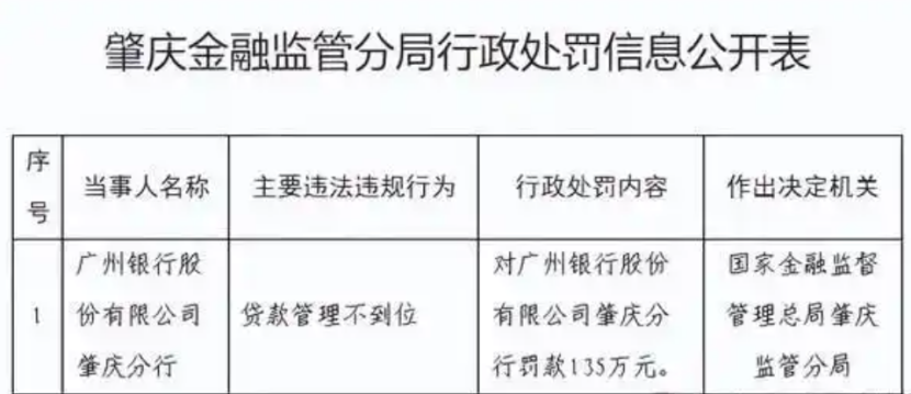 近日,广州银行股份有限公司肇庆分行因贷款管理不到位,被国家金融监督管理总局肇庆监管分局处以135万元罚款。