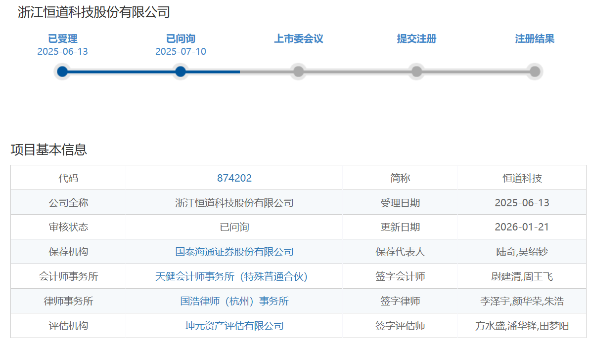 《奕泽财经》从北交所信息公开网获悉,北京证券交易所上市委员会定于2026年1月28日上午9时召开2026年第9次审议会议,审议的发行人为浙江恒道科技股份有限公司(以下简称“恒道科技”)。