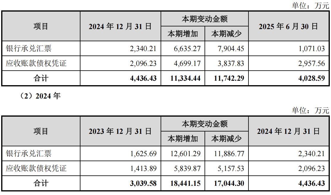 《招股书》也显示,比亚迪自从2023年增加采购之后,恒道科技应收账款债权凭证大幅增加,从2022年年末的1486万元增长至2025年上半年的4436万元。