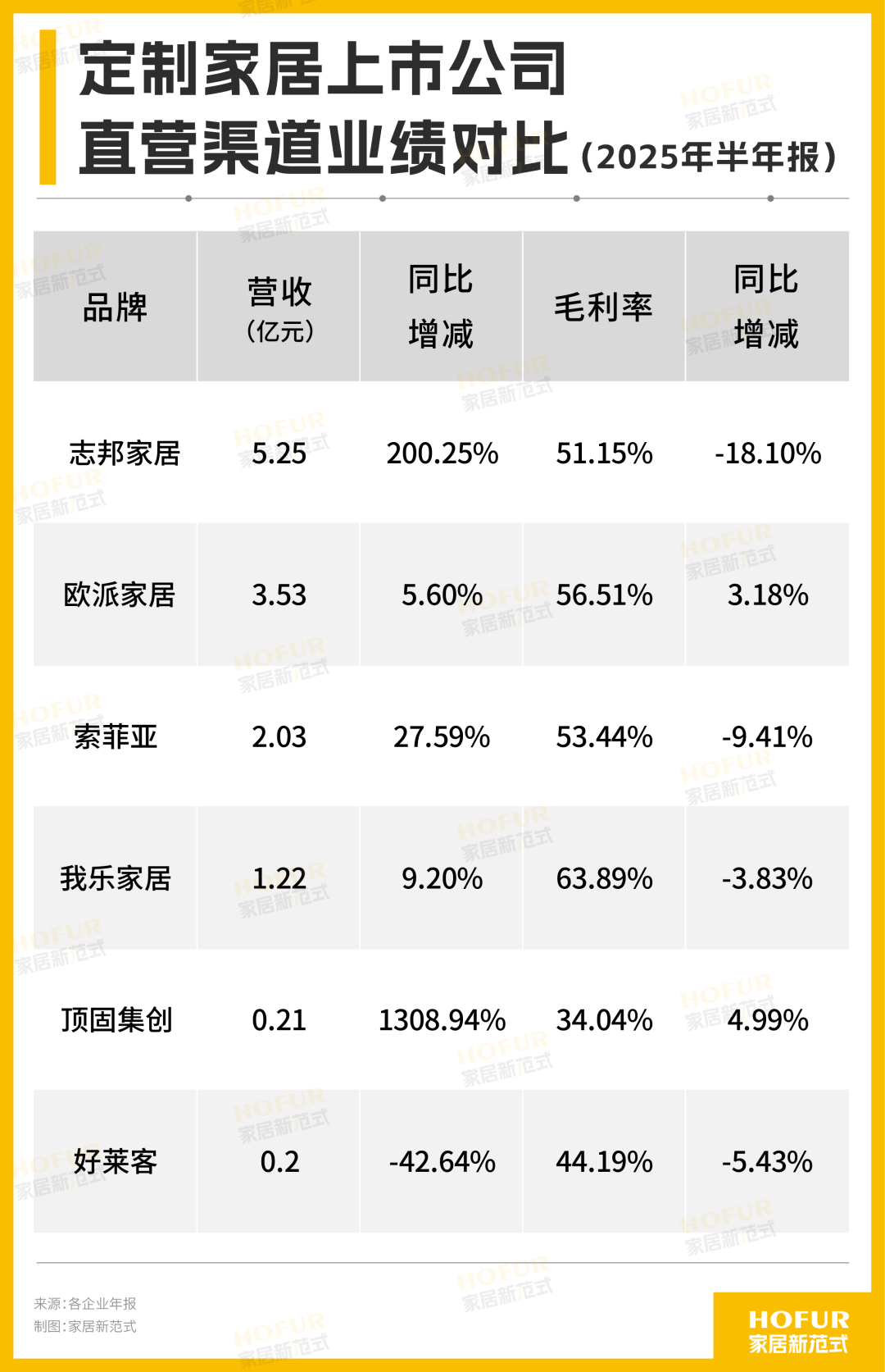这一目标容易吗?财报数据显示,2024年欧派直营店的营收8.33亿元,同比增长0.57%,毛利率57.92%,同比增长0.26%;2025年全年业绩尚未公布,但其上半年的直营渠道营收总共为3.53亿元,同比增长5.6%,毛利率56.51%,同比增长3.18%。