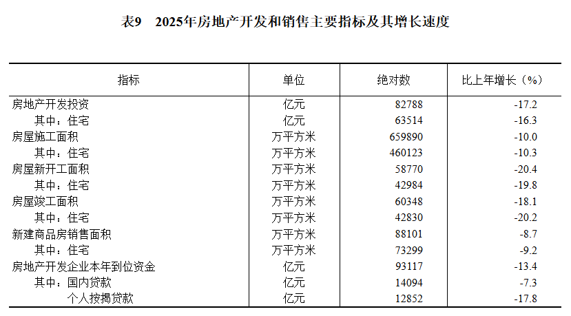 全年房地产开发投资82788亿元,比上年下降17.2%。其中住宅投资63514亿元,下降16.3%;办公楼投资3203亿元,下降22.8%;商业营业用房投资5947亿元,下降14.0%。全年新建商品房销售面积88101万平方米。二手房交易网签面积73685万平方米。年末新建商品房待售面积76632万平方米,其中商品住宅待售面积40236万平方米。