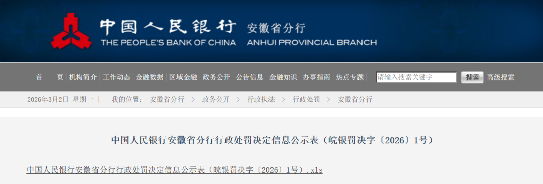2月25日,中国人民银行安徽省分行公示行政处罚决定书,安徽新安银行股份有限公司因“未按规定开展客户尽职调查、未按规定报告可疑交易”两项反洗钱违规,被罚款162.6万元,罚单文号皖银罚决字〔2026〕1 号。