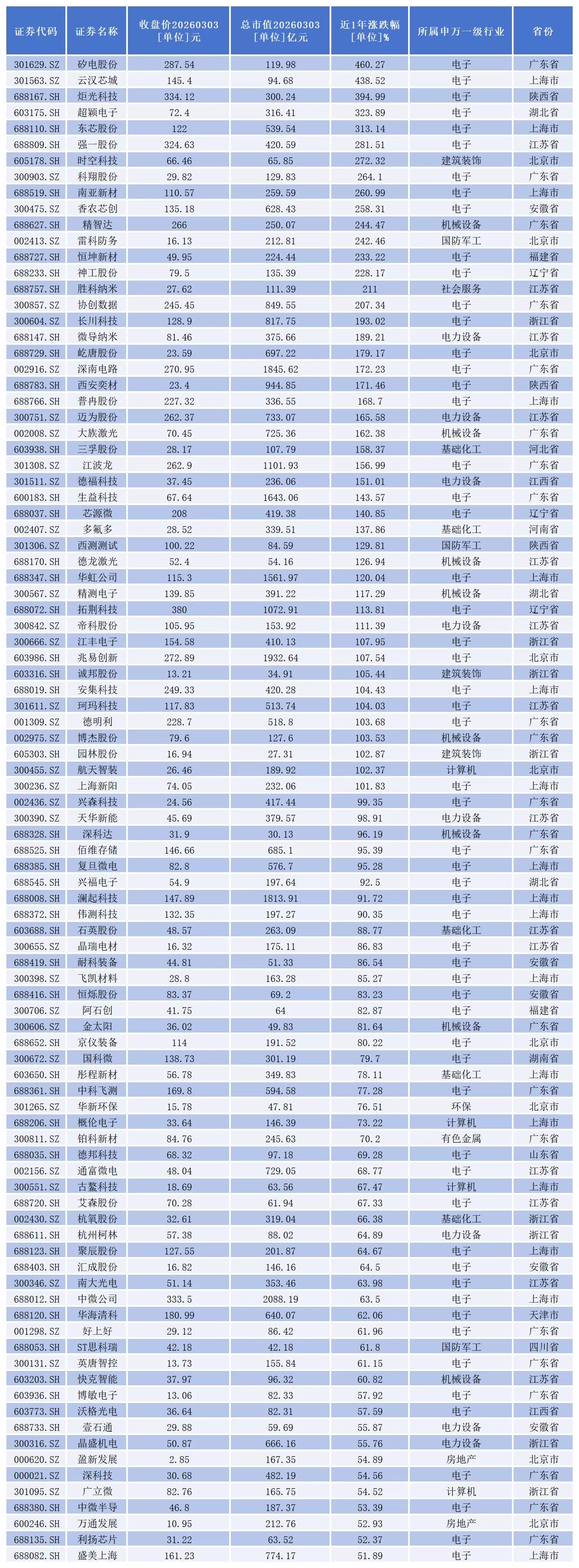 矽电股份(301629.SZ)、云汉芯城(301563.SZ)、炬光科技(688167.SH)、超颖电子(603175.SH)、东芯股份(688110.SH)、强一股份(688809.SH)、时空科技(605178.SH)、科翔股份(300903.SZ)、南亚新材(688519.SH)、香农芯创(300475.SZ)、精智达(688627.SH)、雷科防务(002413.SZ)、恒坤新材(688727.SH)、神工股份(688233.SH)、胜科纳米(688757.SH)、协创数据(300857.SZ)等16家公司近一年股价累计涨幅已超200%。