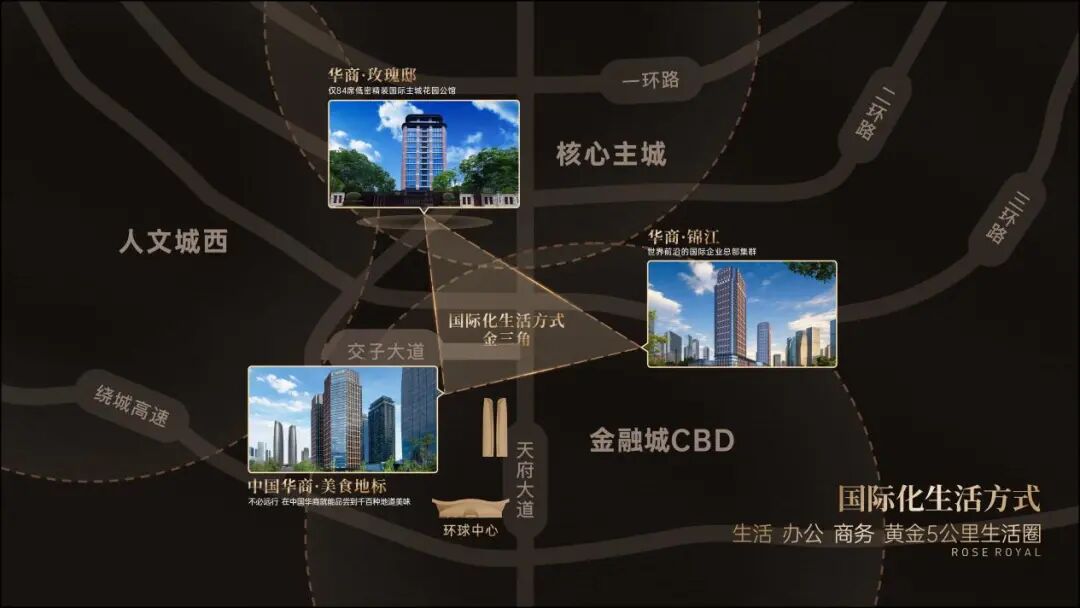 华商·玫瑰邸,定位主城国际花园公馆,距金融城约5公里,当之无愧的金融城后花园。与金融城恰到好处的距离,让项目进享繁华,退享静谧。