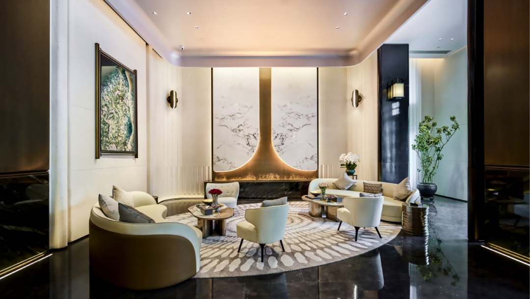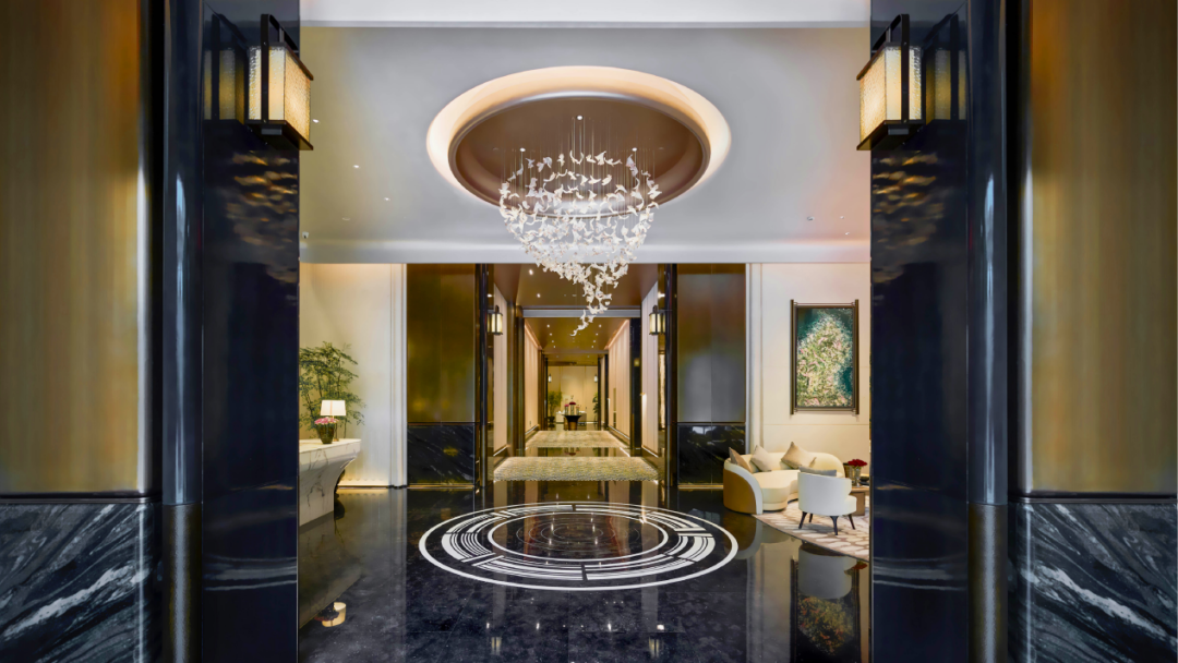 步入大堂,走进媲美五星级酒店的入户门厅,艺术吊灯与定制壁画相映成辉,地面铺装进口大理石,礼序感与仪式感油然而生。