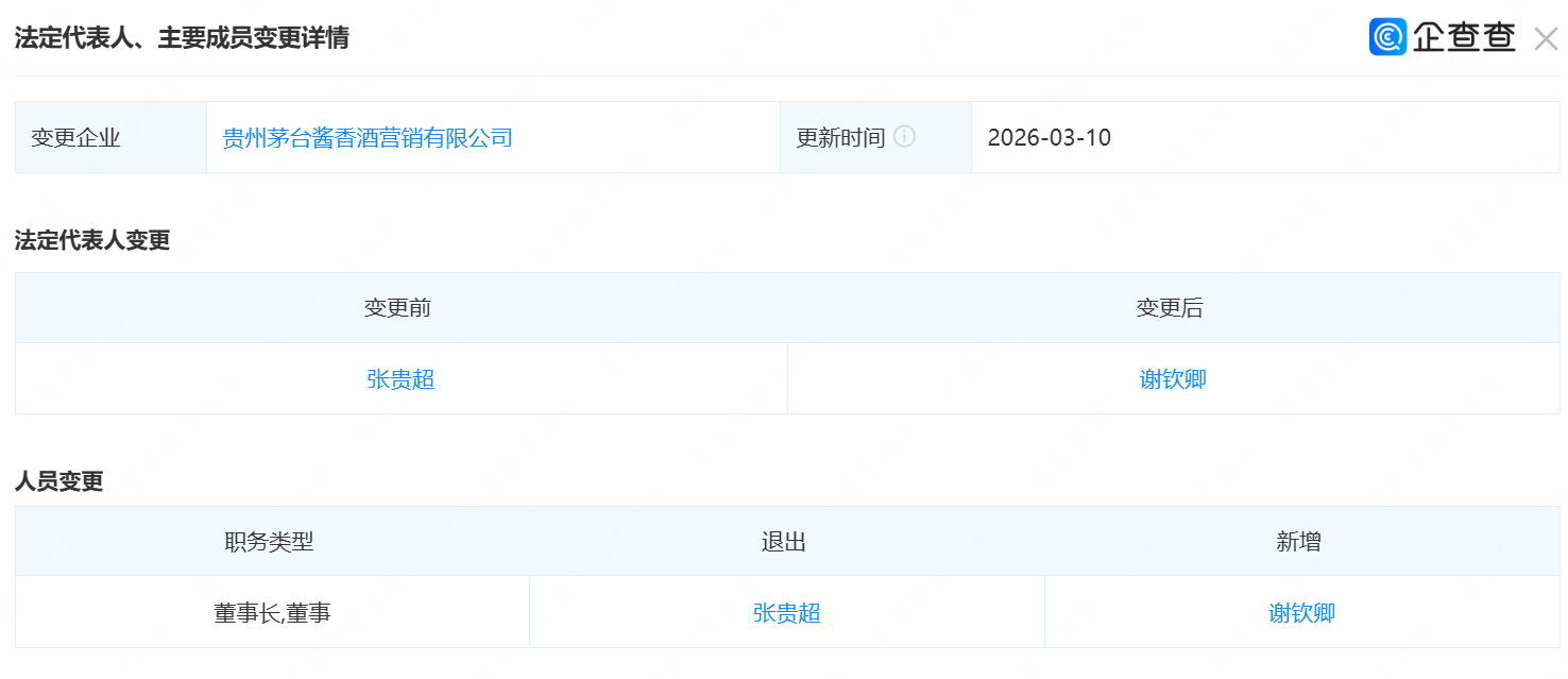 天眼查工商信息显示,近日,贵州茅台酱香酒营销有限公司发生工商变更,张贵超卸任法定代表人、董事长,由谢钦卿接任。