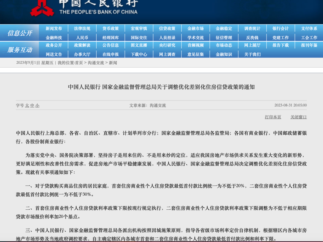 9月1日起,对于贷款购买商品住房的居民家庭,首套住房商业性个人住房贷款最低首付款比例统一为不低于20%,二套住房商业性个人住房贷款最低首付款比例统一为不低于30%;