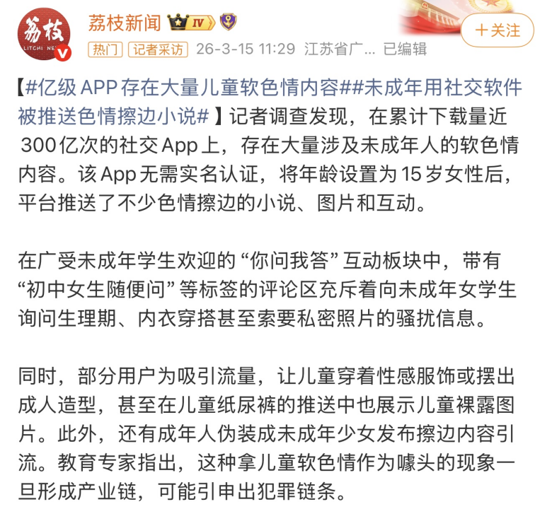 一前一后的两则新闻,无疑是撕开了互联网生态中一道丑陋的疤痕——针对未成年人的软色情侵蚀,正在成为某些平台流量的隐秘来源。