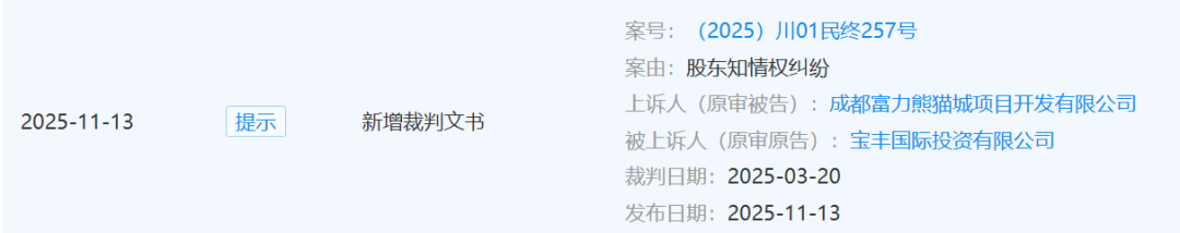 就在今年2月,就在酒店被拍卖前夕,宝丰国际再次将成都富力熊猫城项目开发有限公司告上法庭,要求解散公司,索赔暂估值1.099亿元的利润。