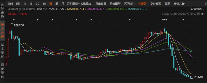 拉长时间看,滴普科技公开发售阶段录得超7500倍超额认购,一度登顶当年港股“超购王”。公司上市发行价为26.66港元/股,于上市第三日(2025年10月31日)触及128.2港元/股的最高点,随后进入回调通道。尽管今年1-2月行情回暖,但近期的断崖式下跌又回吐全部涨幅,最新股价较历史最高点回撤约77%。