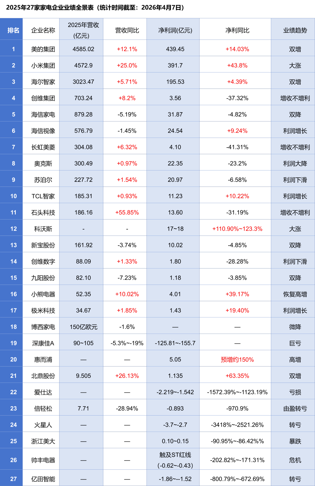 2025年,对于大家居行业而言是充满挑战与深度调整的一年。随着2026年3月底年报披露高峰到来,已有超过40家上市家居、家电企业交出“成绩单”。家居新范式梳理发现,这一轮财报呈现出显著的“冰火两重天”格局:一边是头部家电巨头营收突破3000亿、海外业务高歌猛进;另一边则是家居卖场、建材企业普遍巨亏,定制、成品、木门等细分赛道内部分化加剧。